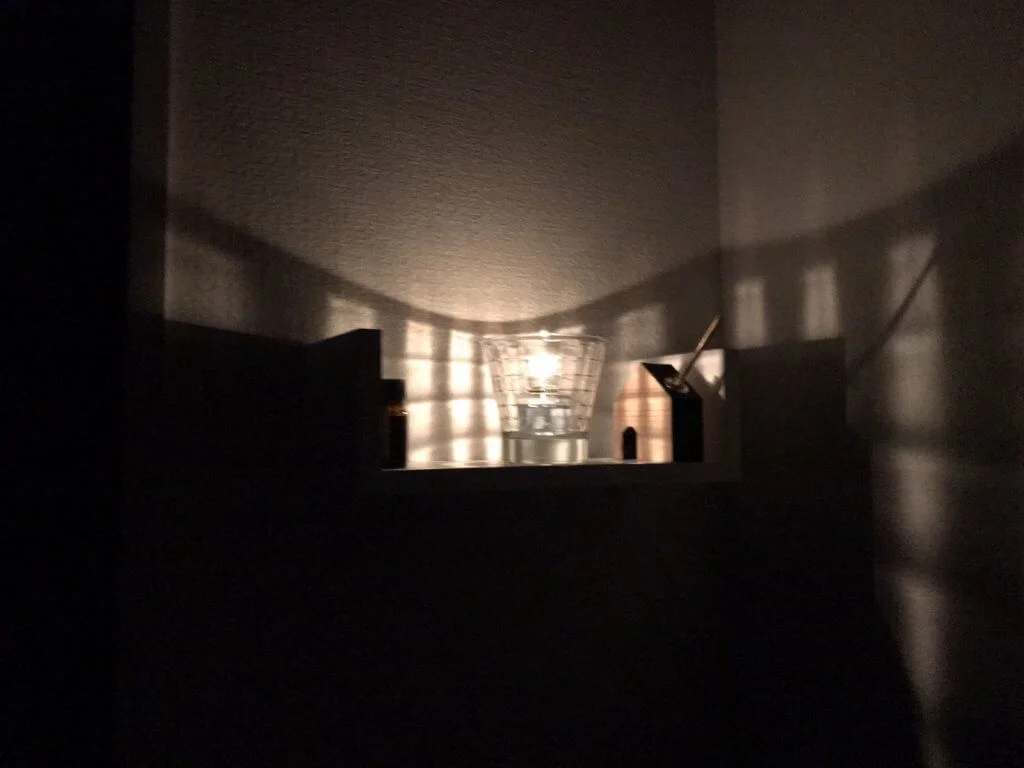 オイルランプ単体でも落ち着く雰囲気となりいい感じなのですが、模様付きのコップにいれることで模様の付いた光模様を楽しむことができます。